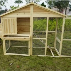 Ces derniers seront bien à l’abri de la pluie et des intempéries sous leur toit à double pente couvert de bardeau bitumé épais et étanche appelé shingle. Une petite trappe placée juste sous son faîte vous permettra de laisser entrer et sortir vos compagnons, si vous le souhaitez bien sûr.