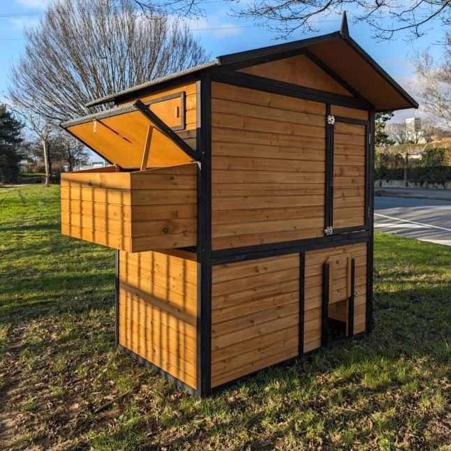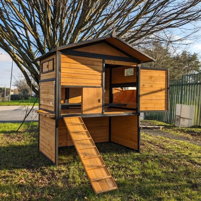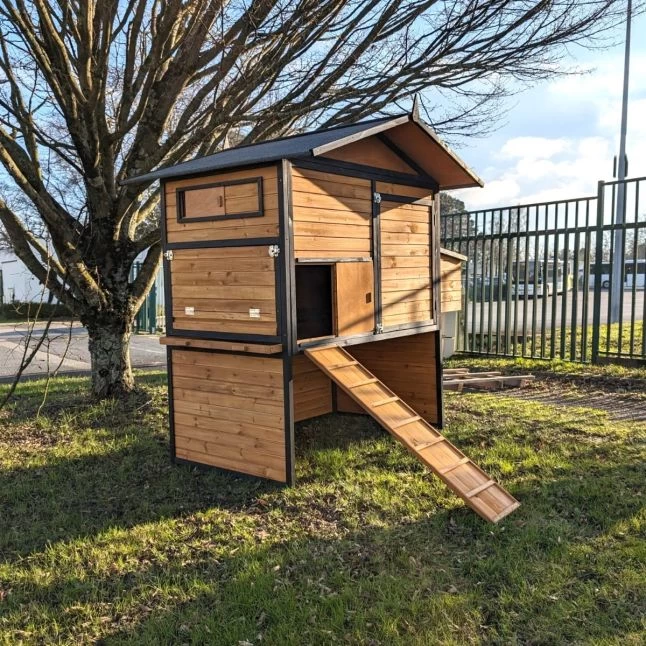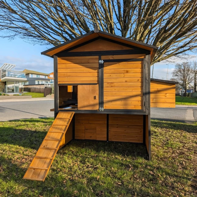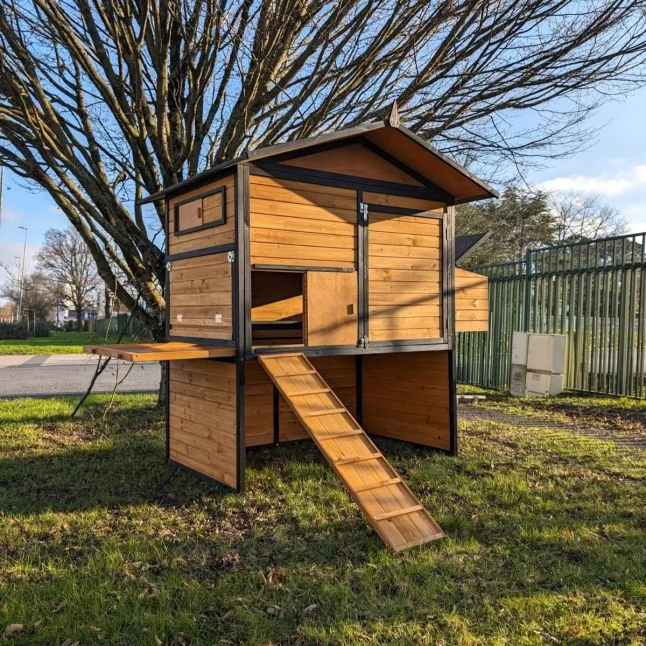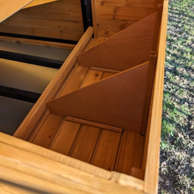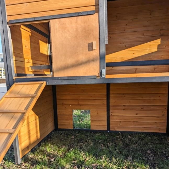Les panneaux en bois de pin affichent une bonne épaisseur de 12 mm et sont fixés sur des montants de 25 par 30 mm. De quoi assurer une bonne robustesse et une bonne durabilité à la maison de vos pondeuses.