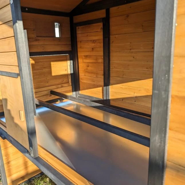 C’est dans une partie nuit spacieuse et chaleureuse que s’installeront vos chères volailles. Elles y trouveront deux grands perchoirs disposés au-dessus d’un tiroir à déjections très pratique pour le nettoyage.